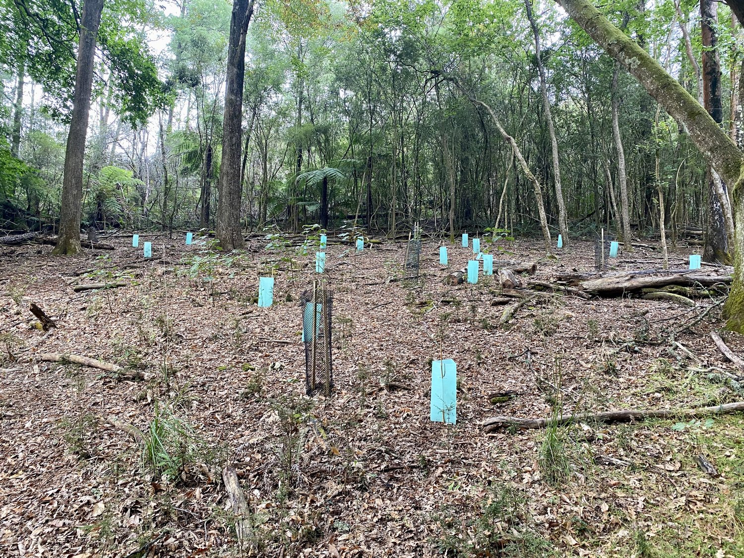 Re-vegetation works undertaken in 2022 with students and the community, see the plants now reaching the top of the tree guards. Looks fantastic.